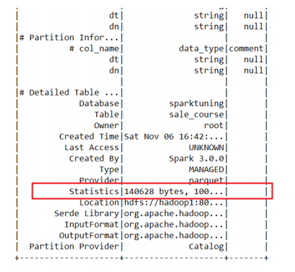: +- FileScan parquet spark_catalog.sparktuning.sale_course[courseid#3L,coursename#5,dt#15,dn#16] Batched: true, DataFilters: [isnotnull(courseid#3L)], Format: Parquet, Location: InMemoryFileIndex(1 paths)[hdfs://hadoop102:8020/hive3/warehouse/sparktuning.db/sale_course/dt=20..., PartitionFilters: [isnotnull(dt#15), isnotnull(dn#16)], PushedFilters: [IsNotNull(courseid)], ReadSchema: struct<courseid:bigint,coursename:string>