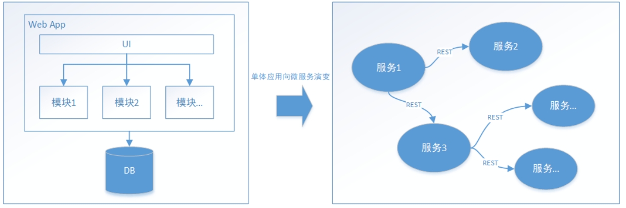 随着互联网的快速发展,软件系统由原来的单体应用转变为分布式应用,下图描述了单体应用向微服务的演变: