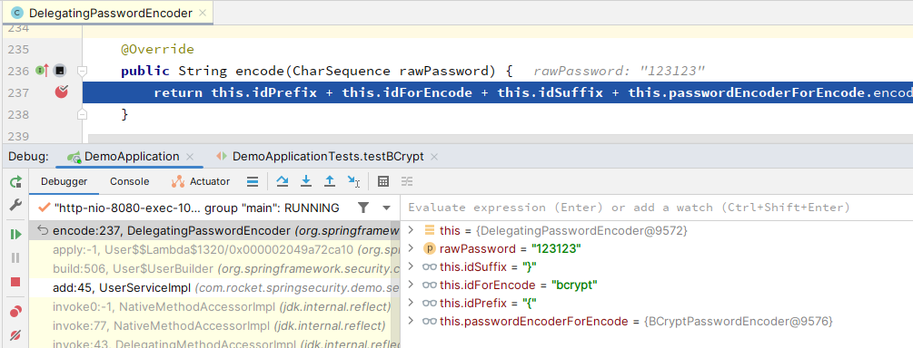 在DelegatingPasswordEncoder的encode()方法中, 可以看到加密后的密码就是由idPrefix+idForEncode+idSuffix+BCryptPasswordEncoder加密的密码: