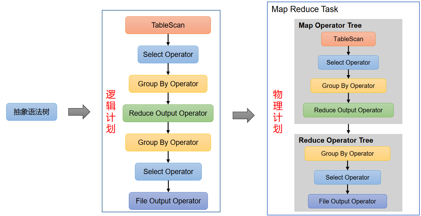 - 逻辑计划生成器(Logical Plan Gen):将语法树生成逻辑计划,如下图执行计划