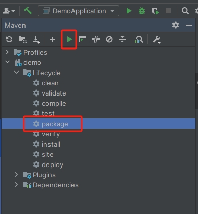 </build>- 执行打包, 选择package命令,点击 ▶️